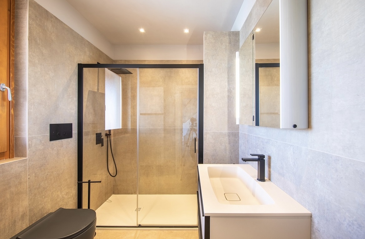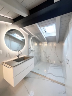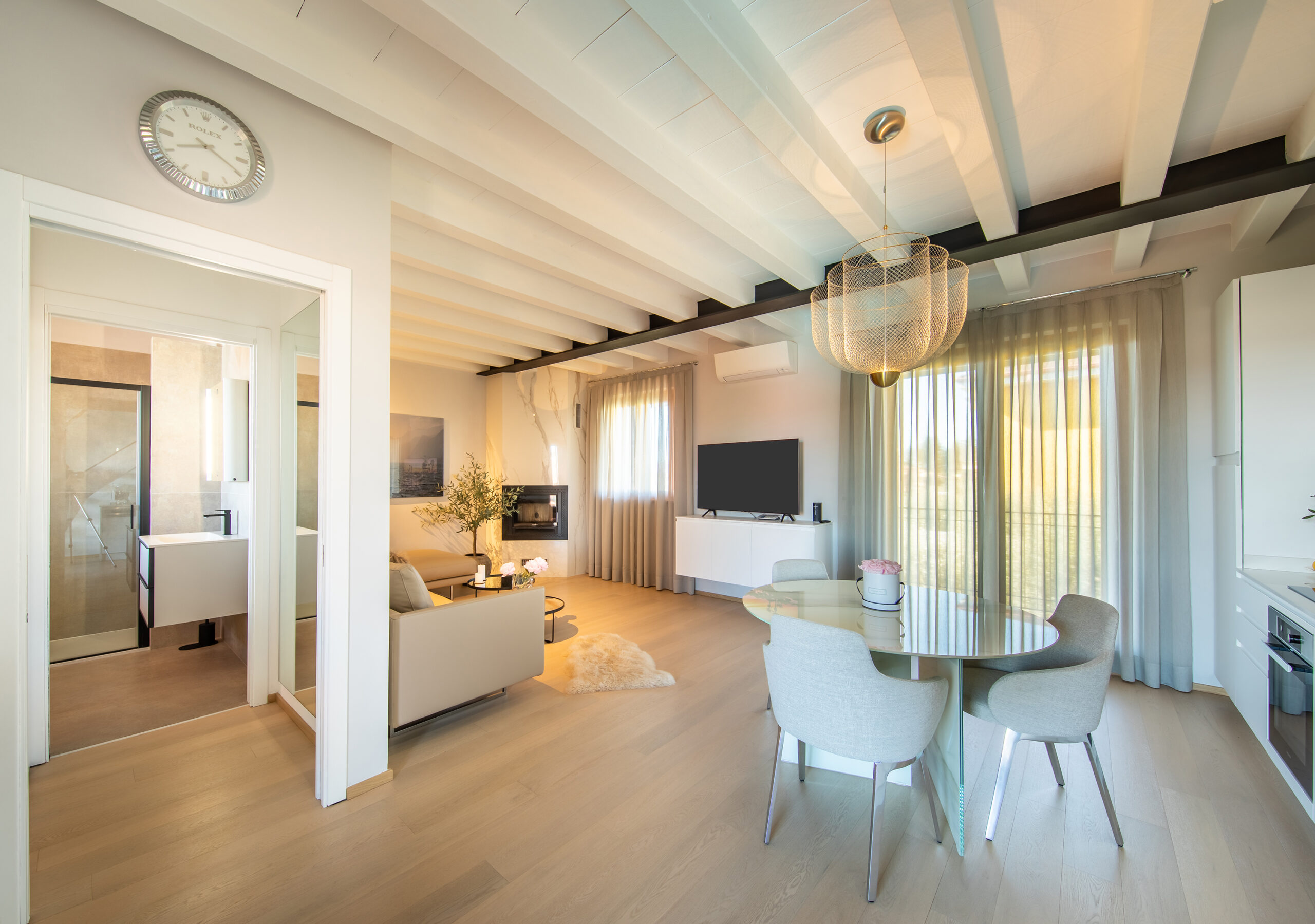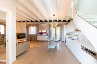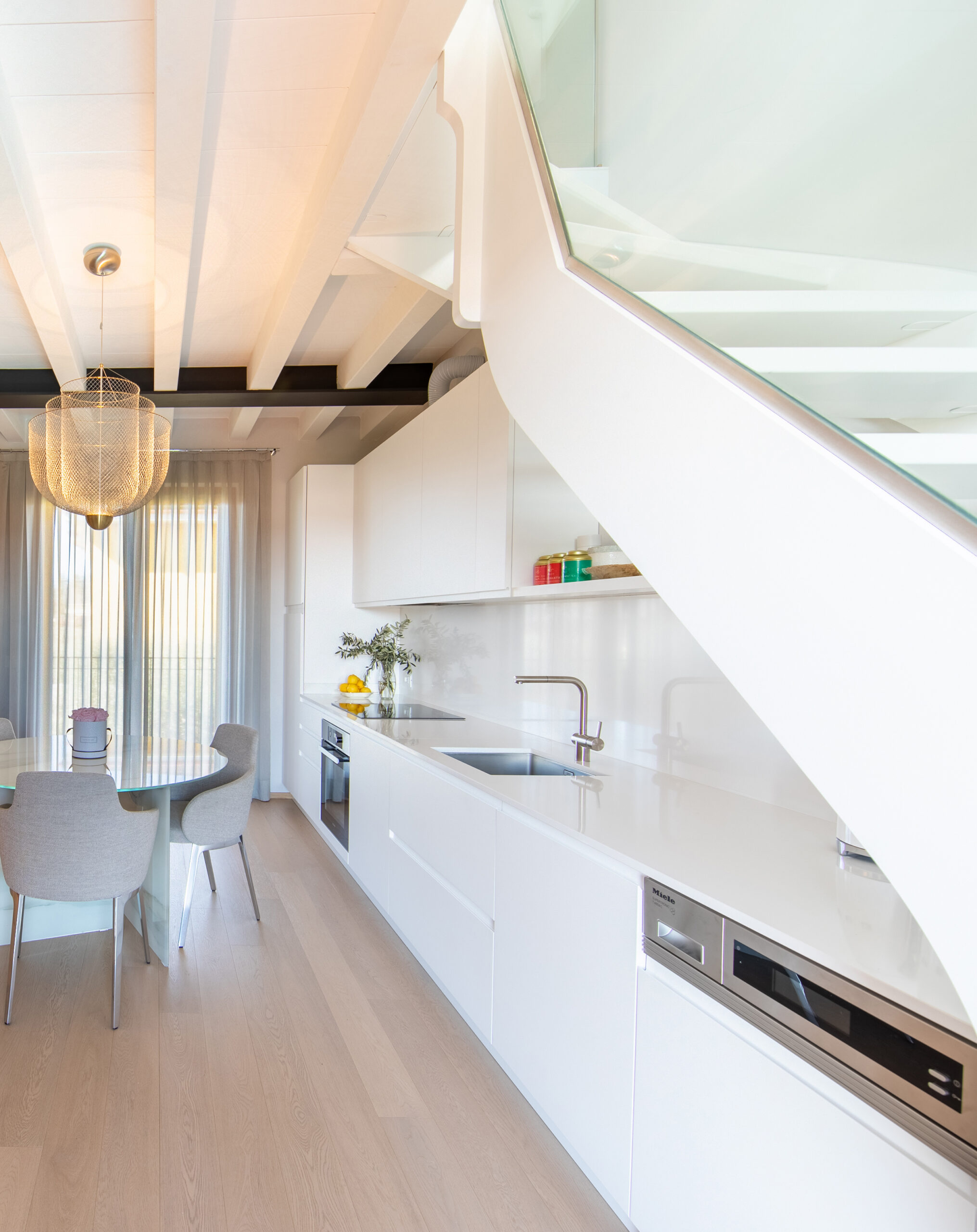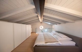Über zwei Ebenen wurde dieses Apartment vollständig neu interpretiert. Die bestehende Dacharchitektur mit sichtbaren Balken bildet das gestalterische Fundament und wurde in eine ruhige, Zeitgemäße Formensprache übersetzt.