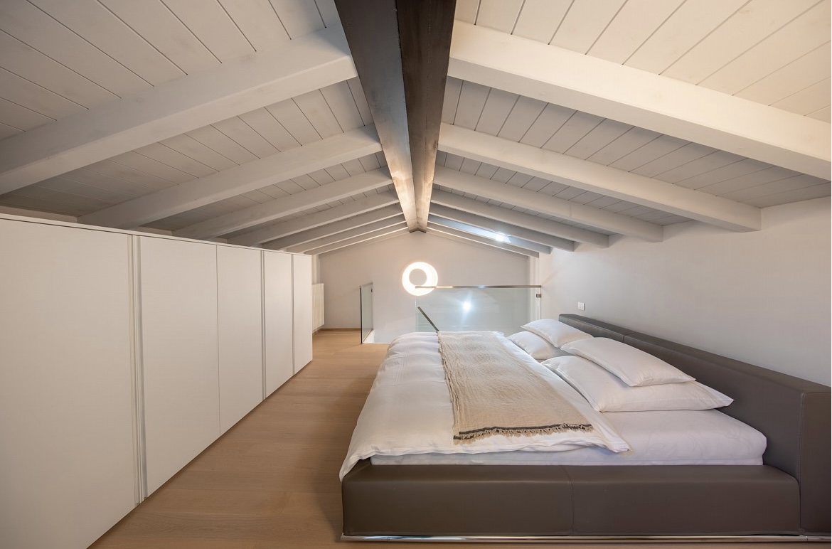 Die obere Ebene nimmt den privaten Rückzugsbereich mit Schlafzimmer und Bad auf. Durch die bewusste Reduktion der Materialien und Farben entstand eine klare, lichtdurchflutete Einheit mit neuer räumlicher Großzügigkeit.